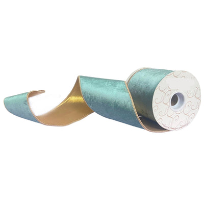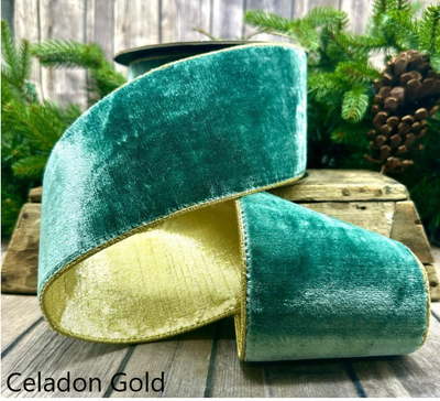 Celadon Velvet Ribbon, 4" x 10 yds, metallic light gold back