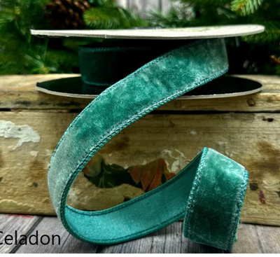 This 1" x 10 yard roll of celadon lush velvet ribbon, with a satin celadon backing is ideal for elevating holiday décor, it adds a warm, sophisticated touch to garlands, trees, and wreath bows, bringing subtle elegance and festive charm to your seasonal arrangements.