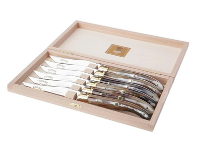 Claude Dozorme Box of 4 Laguiole Steak Knives with Bee Hell Horn Handle