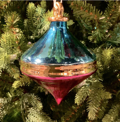 Elevate your holiday decor with this sophisticated hand-blown finial ornament. Its bright blue and hot pink hues, complemented by delicate silver accents, create a festive and eye-catching contrast. The elegant, top-like shape adds a refined touch to any Christmas tree, making it a standout piece that blends traditional charm with vibrant modern style. Measuring 100mm, it’s perfectly sized to enhance your seasonal display with color and grace.