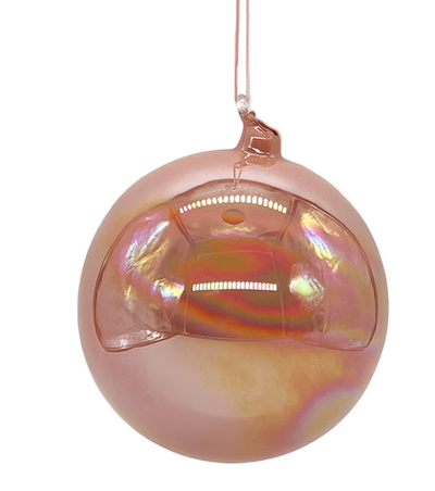This cheerful glass ornament with the translucence of bubblegum and the beautiful iridescent coral color is Artisan made. Hand-blown glass ornaments make a stunning addition to any display. The delicate color makes it a perfect choice to include in a bowl or hang it from the tree with coordinating colors.