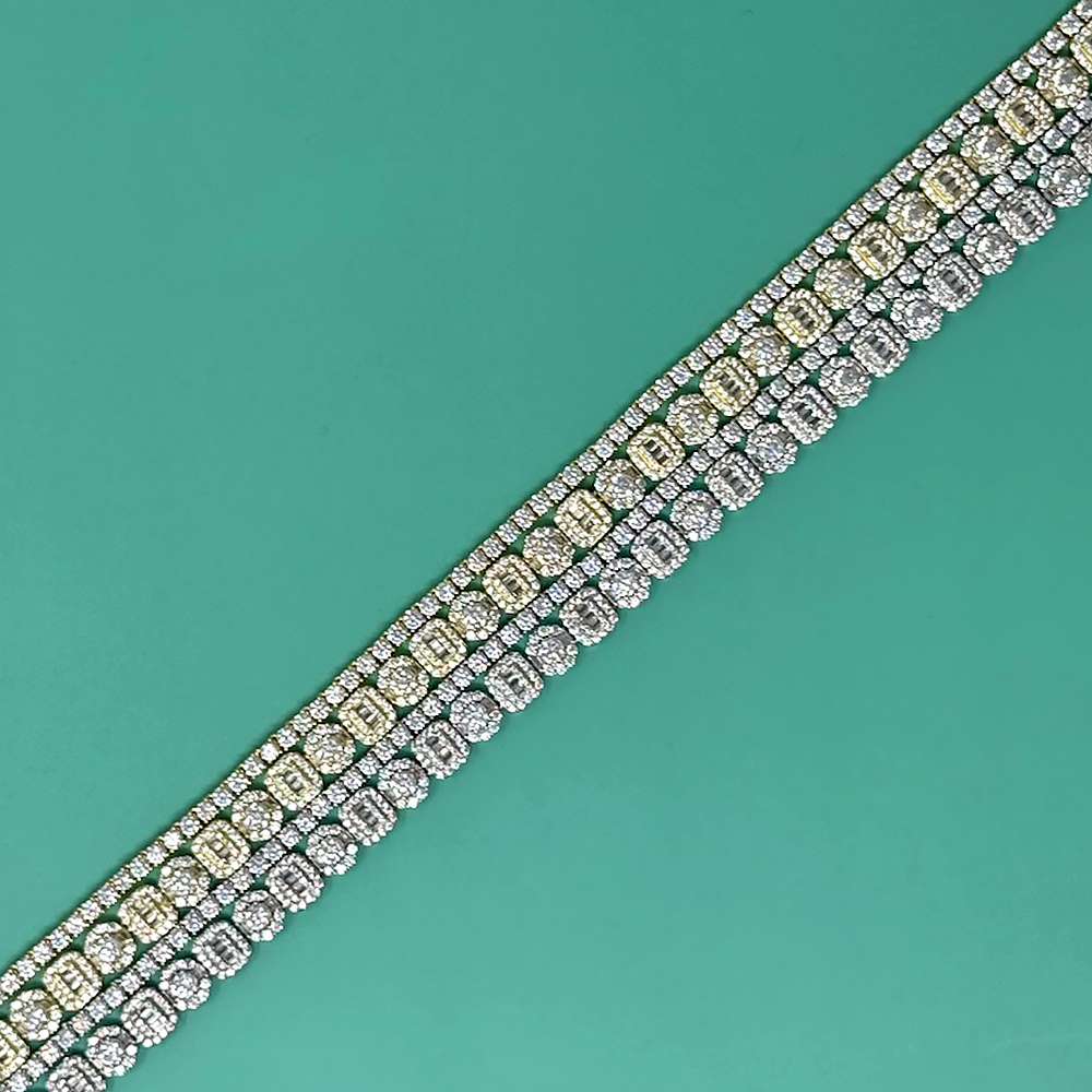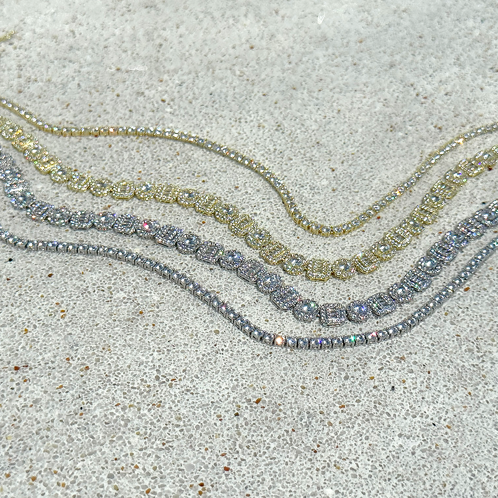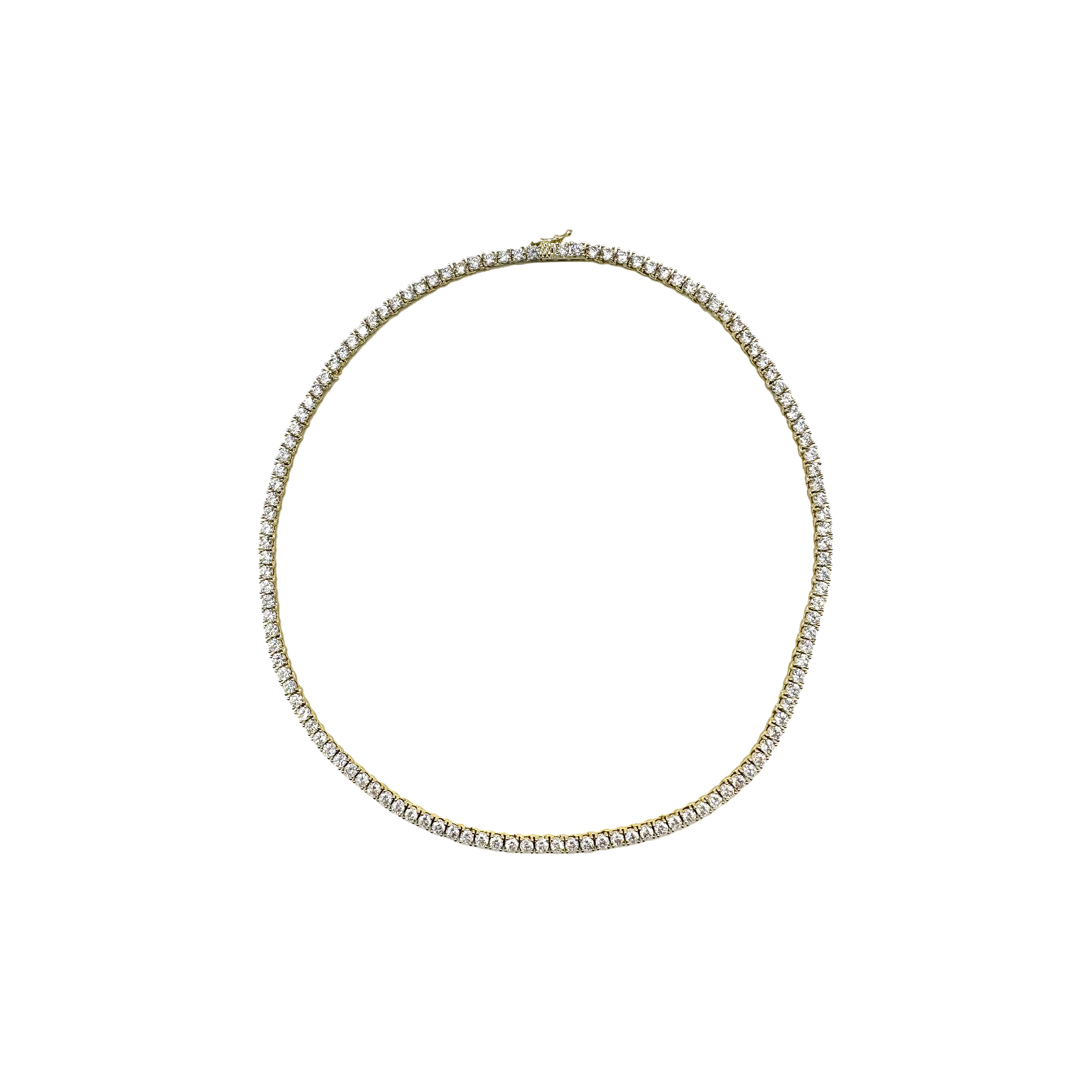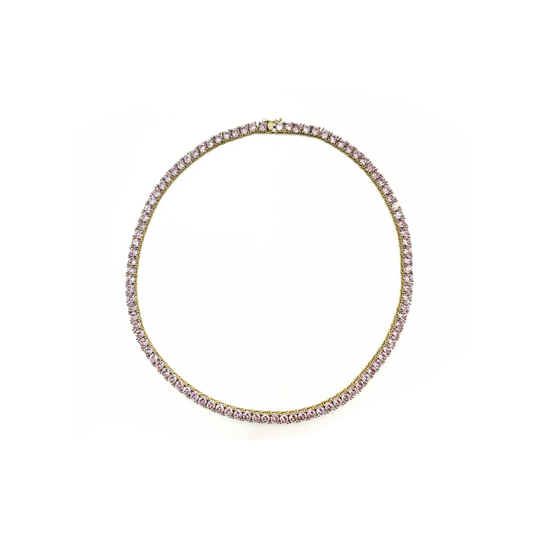 Gold plated brass metal, light pink, brilliant cut CZ tennis necklace 16" length 3 - 4mm brilliant CZ stone in 4 prong setting Box clasp lock