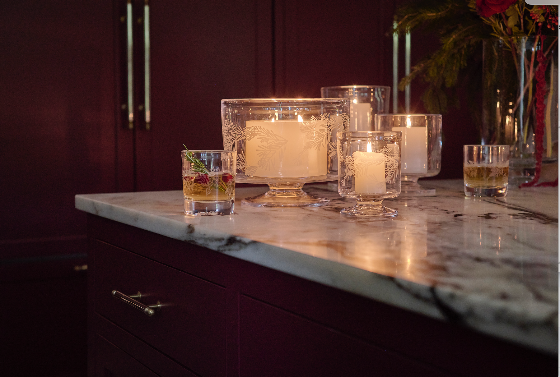 Our low-profile Nantucket Hurricane is reimagined for the season with an engraved pine motif—a nod to winter’s natural beauty. Inspired by hand-drawn sketches and translated into glass with careful precision, this versatile silhouette is equally striking with candlelight, fresh greenery, or seasonal treats.