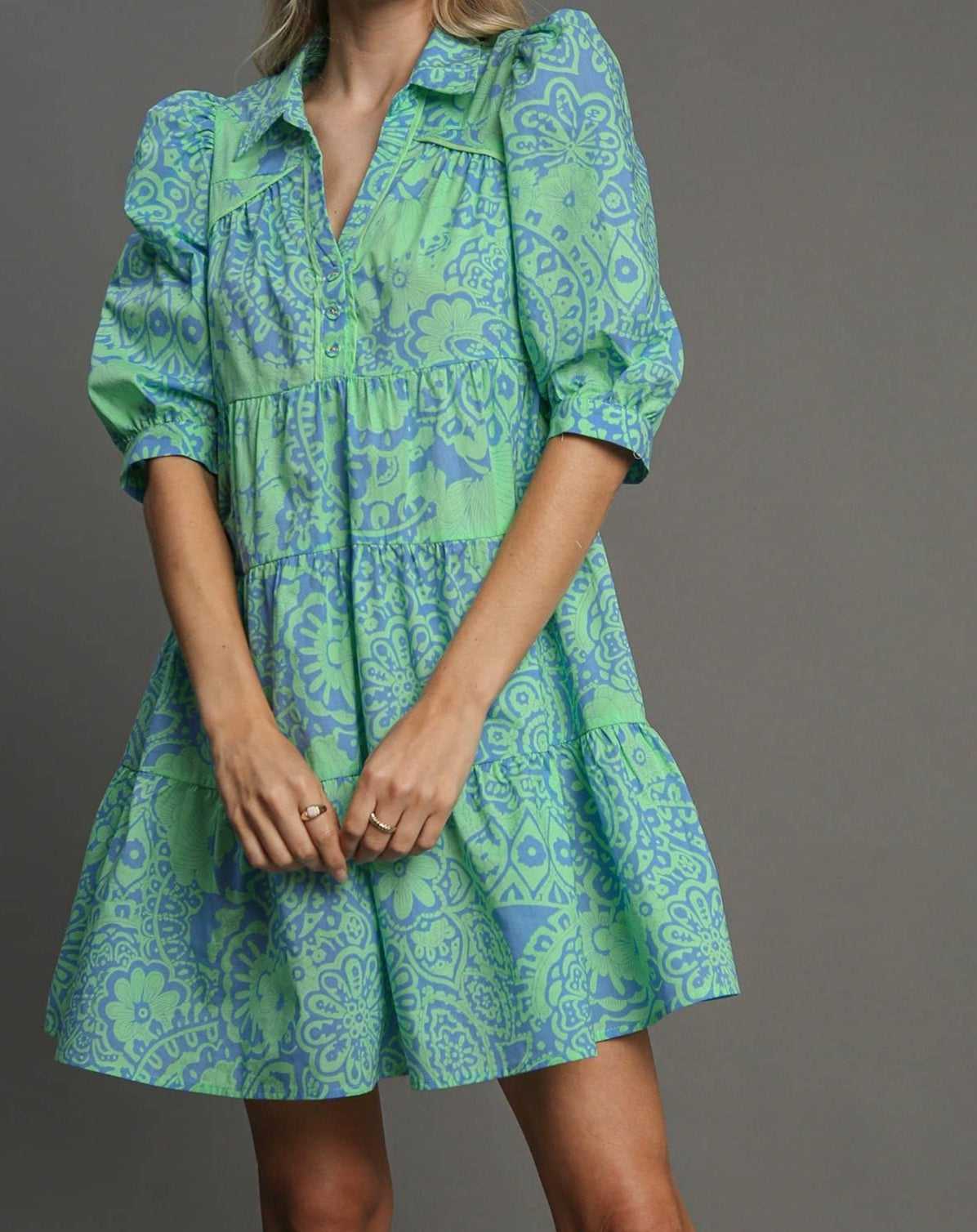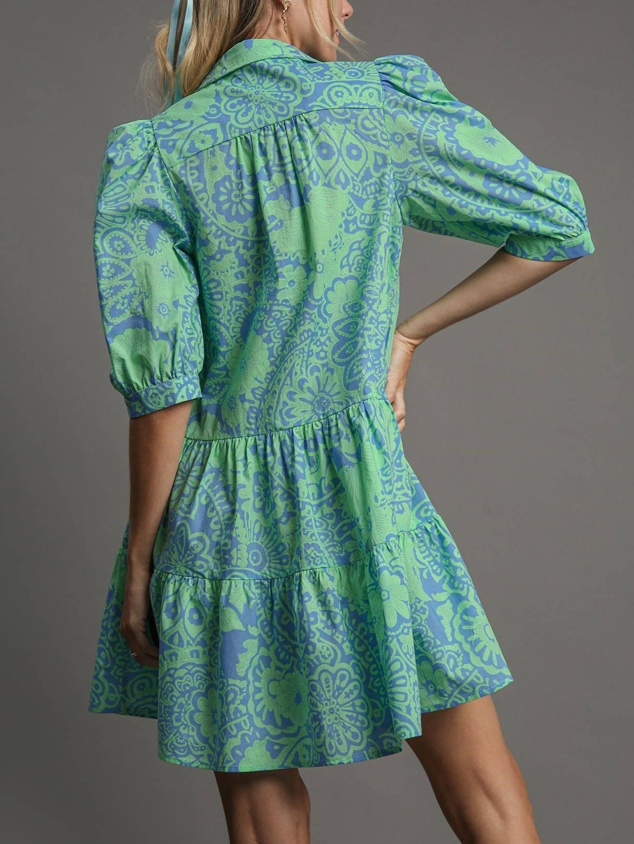 Elevate your everyday style with this effortlessly chic Two-Tone Print A-Line Dress. Featuring a refreshing blend of green and blue hues, this dress offers a flattering tiered silhouette that flows gracefully with every step. Crafted from 100% breathable cotton, it’s perfect for warmer days. The 3/4 sleeves provide a balanced look, while contrast piping adds a refined finishing touch. Lightweight and unlined for maximum comfort, this dress is your go-to choice for casual outings or relaxed gatherings.